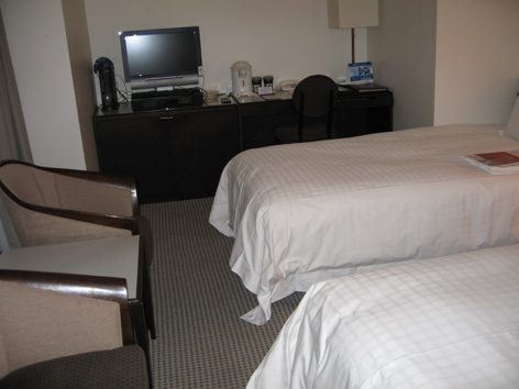 余談だが、バスルームの2段あるトイレットペーは下の段が説明書きの入ったケースで覆われていて、上の段を使い切らないと使えないようになっている。「環境のため・・・」と説明がありもっともな事で、好感が持てた。どこのホテルもいっそのこと歯ブラシなどは全廃すればよいのにといつも思う。写真