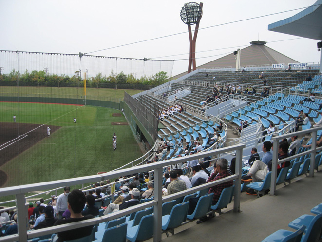 高校野球の夏の甲子園予選、春季、秋季大会等で使われる。内野のファウルゾーンは人工芝、なまじ土のままのほうが良いと思う。スピードガンの表示がある。駐車場は思ったほど多くはなく、夏の予選準決勝あたりからはかなり混み合うので、早めの到着を勧める。他の催し物と重なると春季大会準々決勝あたりでも9時過ぎには満車になることも。
