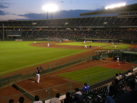 野外の球場で天然芝、ブルペンが見えるなど本来野球場はこうでなければいけない。6回ごろ行われる